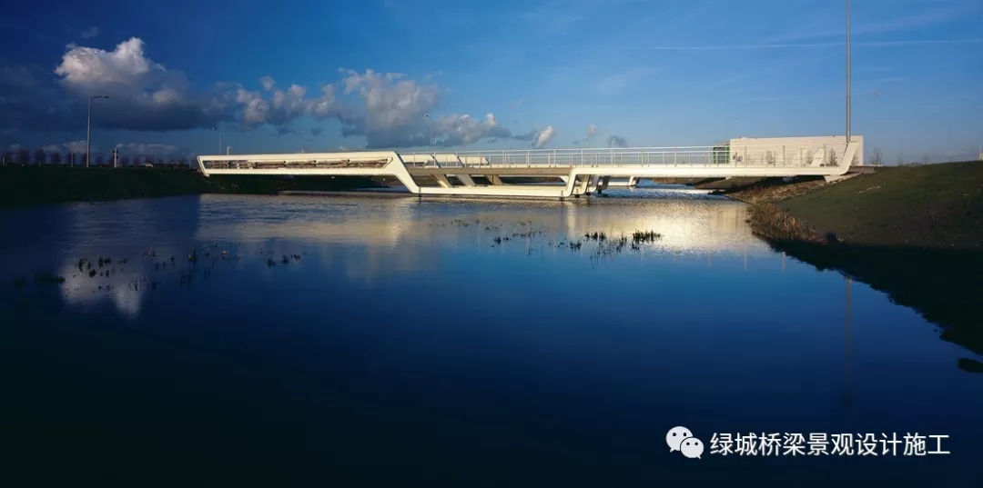 商业园区的中间是一个叫“De President shof”的集中公园。该公园却打破了死板的开拓地格局,通过有机的设计形成一个全新的形象。在“De president”商业园区中,Drost + van Veen建筑事务所设计了12座桥梁:9个慢速交通桥梁和3个快速交通桥梁。